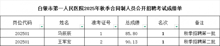 白银市第一人民医院2025年秋季合同制人员公开招聘考试 成绩公告 2025-10-15 15:36白银市第一人民医院 现将白银市第一人民医院2025年秋季合同制人员公开招聘考试成绩公布如下。 详见附件:《白银市第一人民医院2025年秋季合同制人员公开招聘考试成绩单》 白银市第一人民医院 2025年10月15日