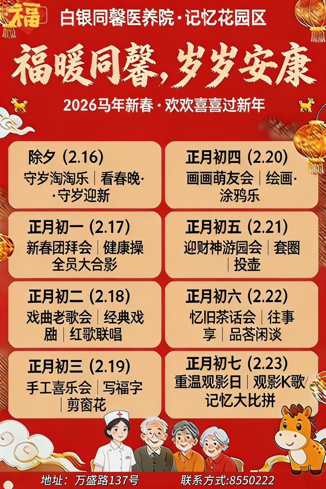 从除夕守岁到正月初七,记忆花园区、专业照护区、活力养老区根据老人的不同需求,量身打造了丰富的活动内容: