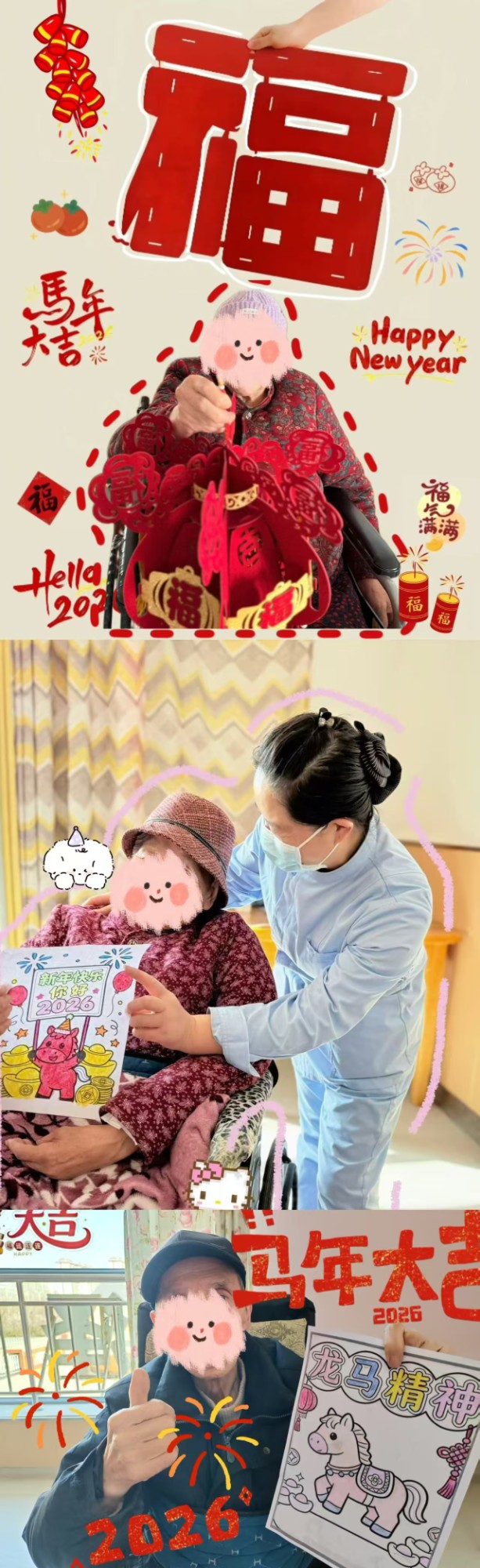 专业照护区:工作人员们在新春期间既注重温情陪伴,组织了福马迎春拍照、剪纸传情、歌曲串烧、故事分享等活动,也始终坚守岗位,将细致入微的关怀融入日常照料。